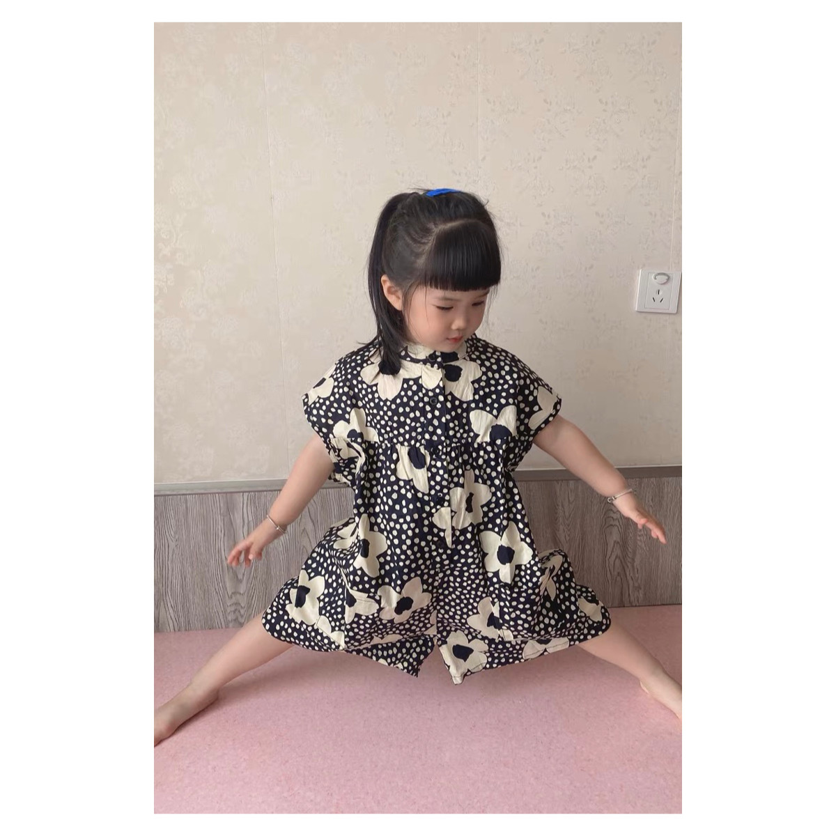黑底花系連身褲,材質是超級涼爽的薄棉布,寬闊的版型寶貝穿起來超自在☁️